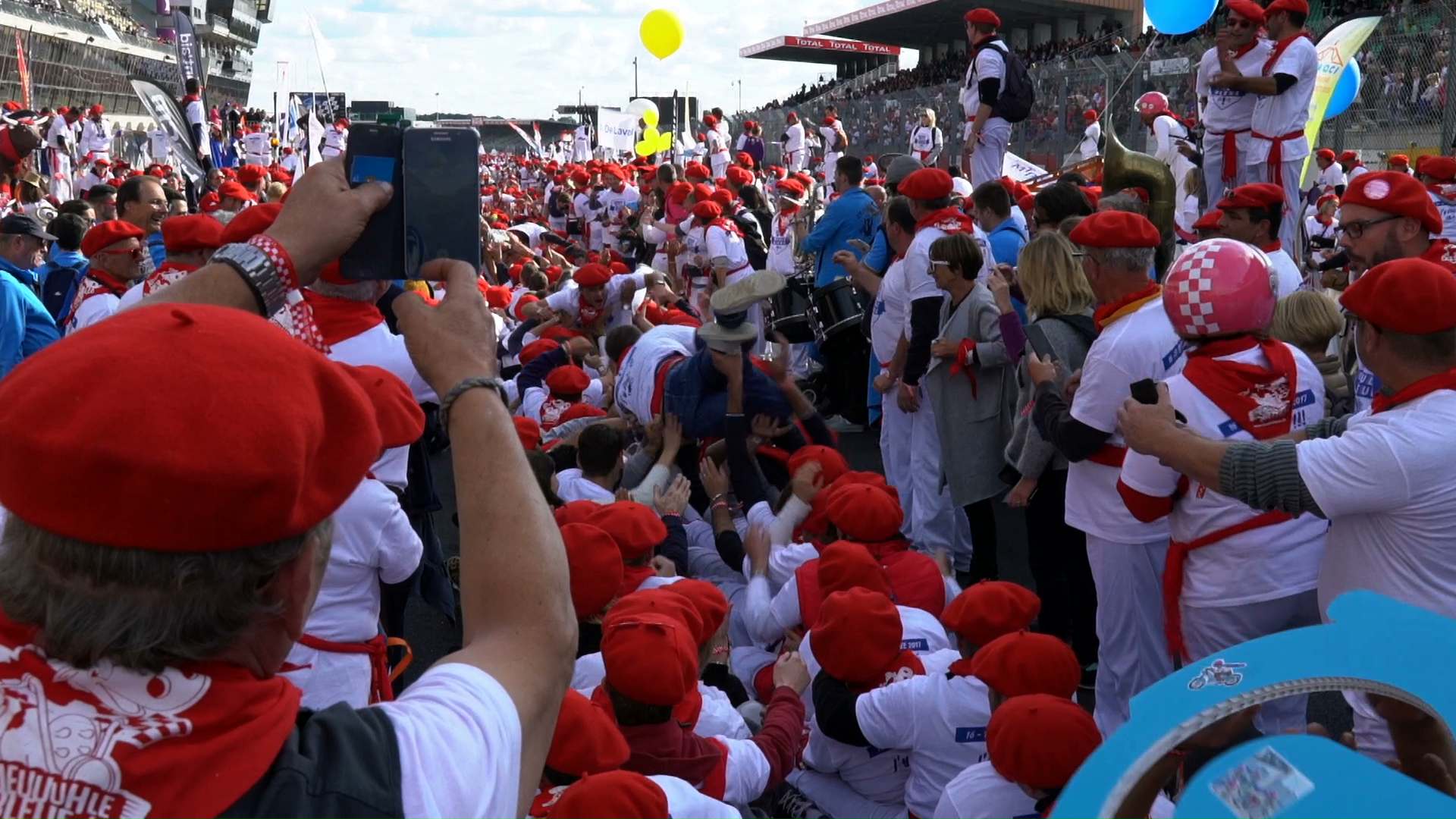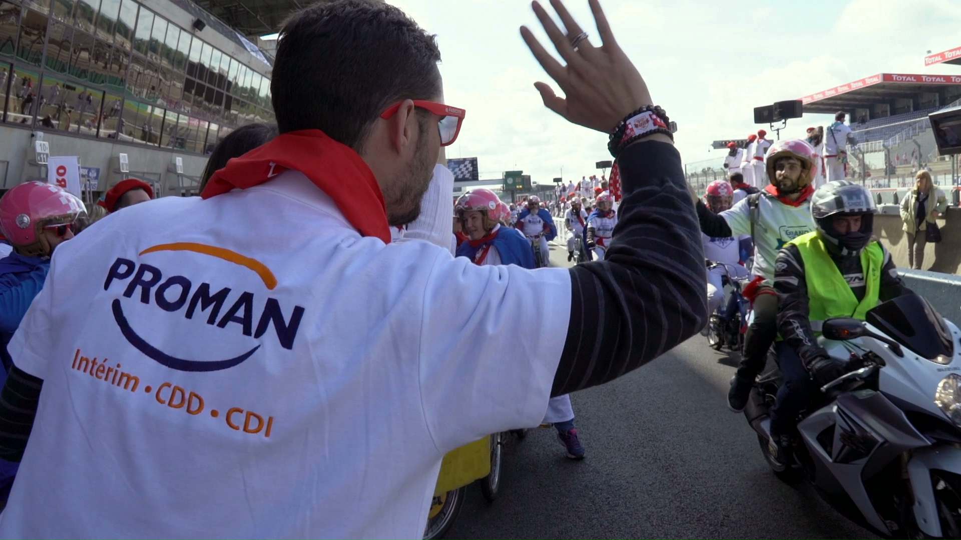 Malgré la grisaille ambiante, je vois l'ensemble des participants et spectateurs qui sont habillés en rouge et blanc, une ambiance Sud-Ouest qui réchauffe les coeurs!! Il fait déjà plus chaud et je sens que la journée va être bonne. Je retrouve mon équipe Proman avec leur "Bar" vache tagué !!! L'ambiance est démente, on rentre dans l'enceinte mythique du circuit des 24H du Mans et là c'est "Retour vers le Passé!!!", on se croirait à un concert de Renaud. Ca bricole les moteurs, les meules hurlent!!!! Le départ va être lancé, c'est parti !!! Je ne sais où filmer, c'est un vrai festin pour un caméraman!!! Merci Proman de m'avoir permis de vivre cette folle journée!!!